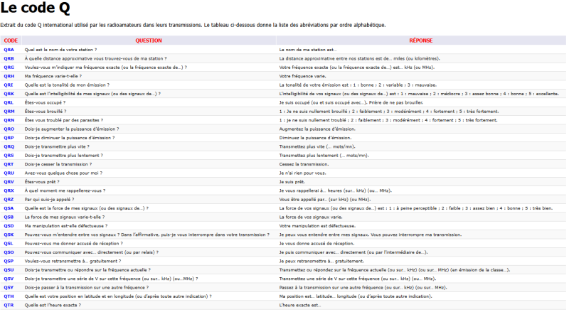 Les radioamateurs du monde entier utilisent le Code Q (dérivé de codes militaires) permettant de se comprendre facilement malgré la barrière de la langue. Ces raccourcis de 3 lettres permettent de coder les infos principales échangées lors d'un ... QSO.